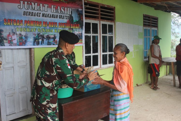 JAGOK.CO - LEMON NTT - Program Unggulan "Jumat Kasih" dari Satgas Yonkav 6/Naga Karimata kembali bergerak untuk menyebarkan kebaikan dan munculkan senyuman warga sekitar Desa Lemon, Kec. Miomaffo Barat, Kab.TTU, Prov. NTT, pada 26 Januari 2024. Dengan menghadirkan Truck Senyum sebagai pembawa kebahagiaan, Mako Satgas Yonkav 6/Naga Karimata menyebarkan bantuan kepada masyarakat sekitar, termasuk bantuan kesehatan, tenaga, dan berbagi makanan di perbatasan.