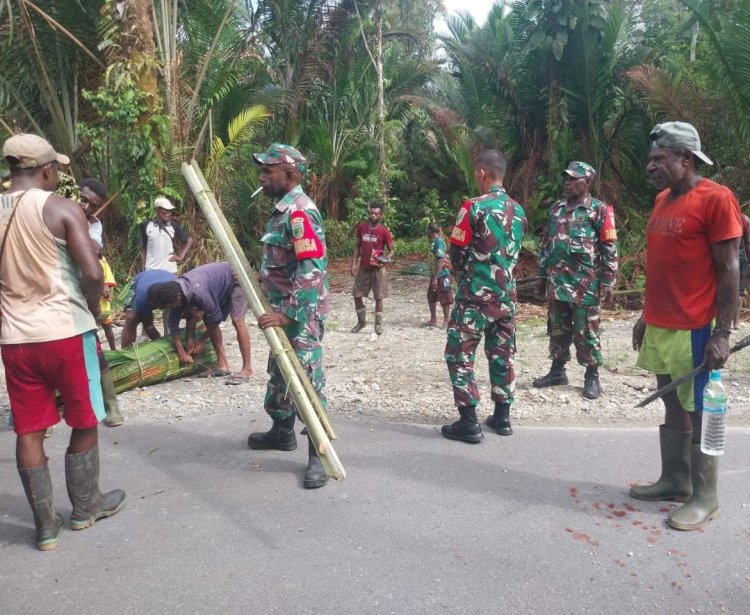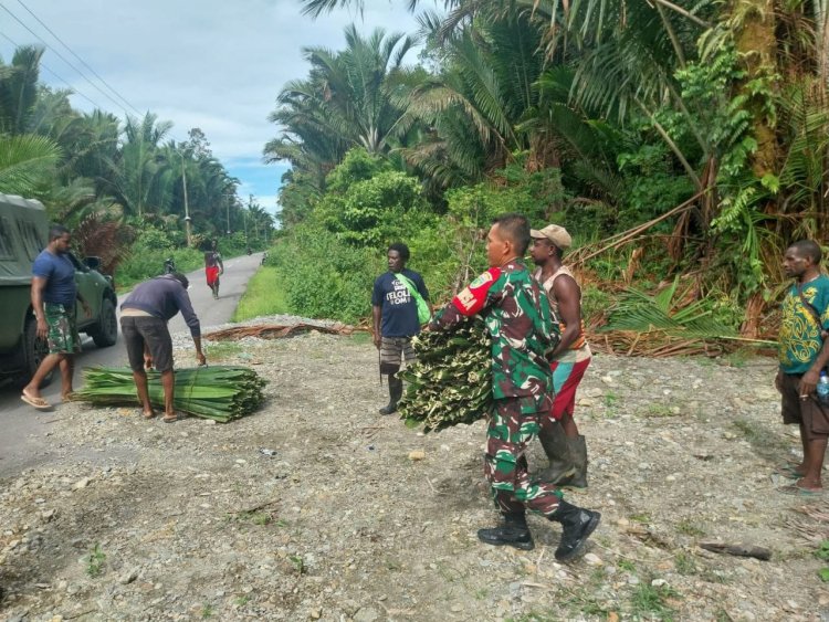 JAGOK.CO - TMIKA - Dalam menjaga kelestarian adat budaya di Papua, Babinsa Koramil 1710-03/Kuala Kencana, dipimpin oleh Serka Noben Wenda, bersama warga turut serta dalam pengambilan pelepah daun sagu di sekitar hutan Kampung Iwaka, Distrik Iwaka, Kabupaten Mimika pada Rabu (24/01/2023). Pelepah daun sagu ini memiliki nilai penting dalam acara adat dan pembangunan rumah tradisional.
