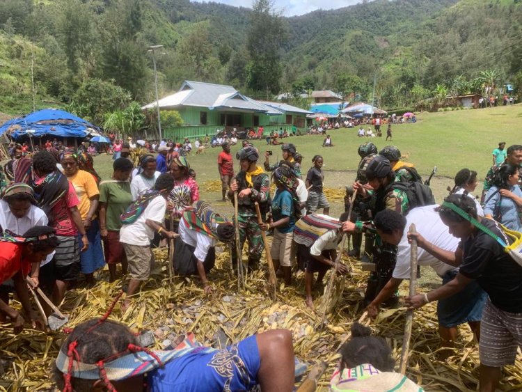 Satgas Mobile Raider 300 Siliwangi Ramaikan Acara Bakar Batu Bersama Masyarakat Kab. Puncak Papua