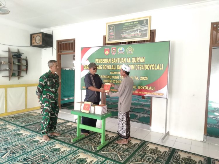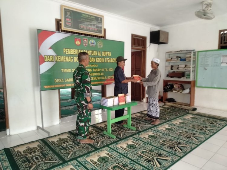 JAGOK.CO - BOYOLALI – Sebagai bentuk nyata dukungan terhadap penguatan nilai-nilai religius masyarakat di wilayah sasaran, Satgas TNI Manunggal Membangun Desa (TMMD) Sengkuyung Tahap III Tahun 2025 Kodim 0724/Boyolali menyalurkan bantuan Al-Qur’an untuk Masjid Al Amin, yang terletak di Desa Sarimulyo, Kecamatan Kemusu, Kabupaten Boyolali, pada Sabtu (26/07/25).