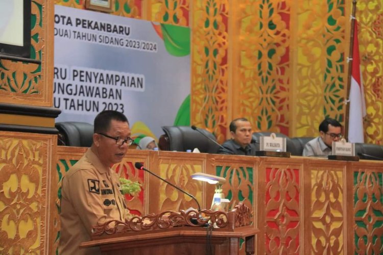 JAGOK.CO - PEKANBARU - Sekdako Pekanbaru Menyampaikan LKPj 2023 kepada DPRD untuk Evaluasi Kinerja Pemerintah Kota, (Pj) Wali Kota Pekanbaru, Muflihun, S.STP, M.AP, diwakili oleh Sekretaris Daerah Kota (Sekdako) Indra Pomi Nasution, ST, M.Si, telah menyampaikan Laporan Keterangan Pertanggungjawaban (LKPj) tahun 2023 ke DPRD setempat.